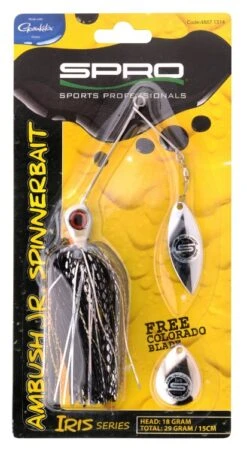 Spinnerbaits zijn bij uitstek het meest geschikte kunstaas wanneer men vist in zwaar begroeid water. Waterplanten, overhangende takken, boomstronken, lelievelden, rotsen; de IRIS Ambush Junior voelt zich er thuis en loopt feilloos over allerhande obstakels zonder vast te raken. De compacte Ambush Junior Spinnerbait is uitgevoerd met extra grote ogen, een attractieve rubberen skirt, versterkt frame, en wordt standaard geleverd met een Willow en Colorado spinnerblad. Met zijn bescheiden lengte van 15cm en een totaal gewicht van slechts 29 gram is dit de perfecte all-rounder om zowel op klein als groot water in te zetten.